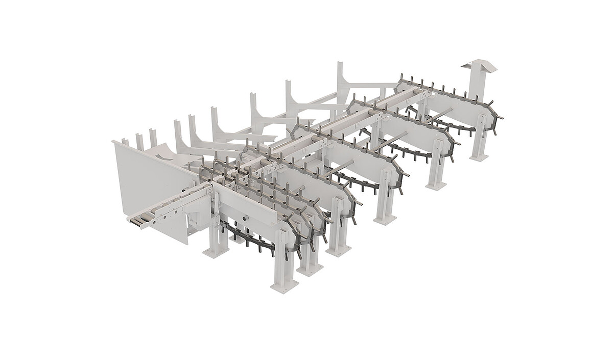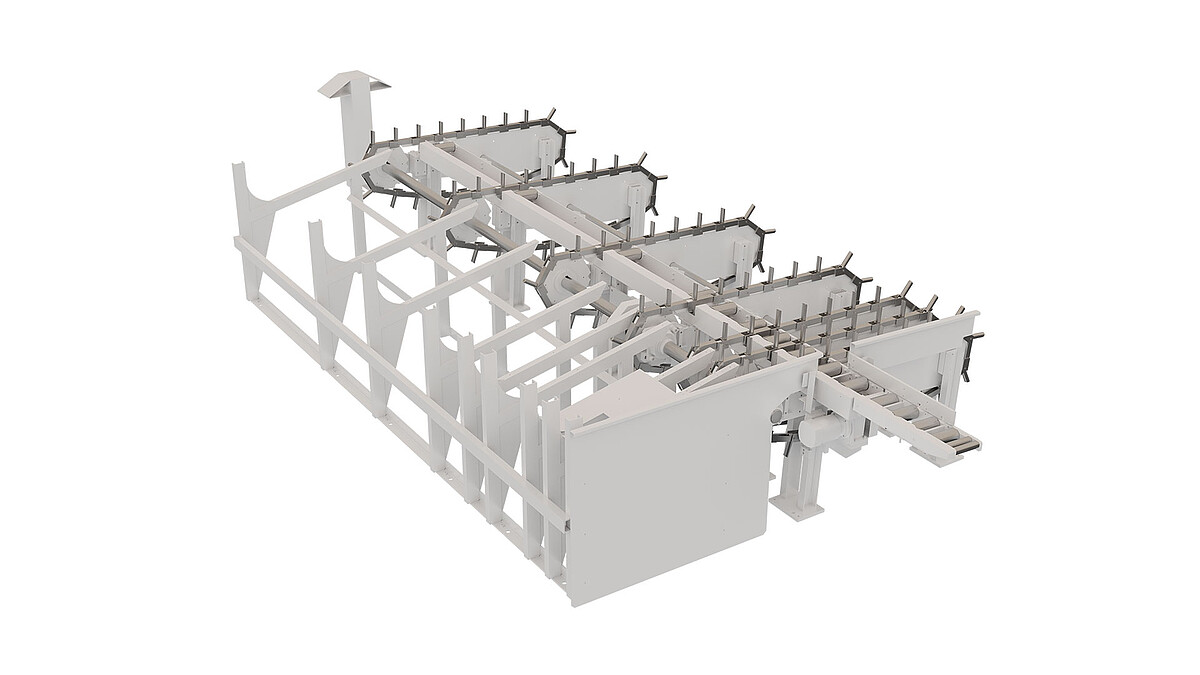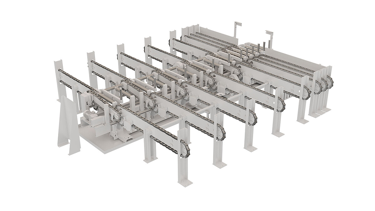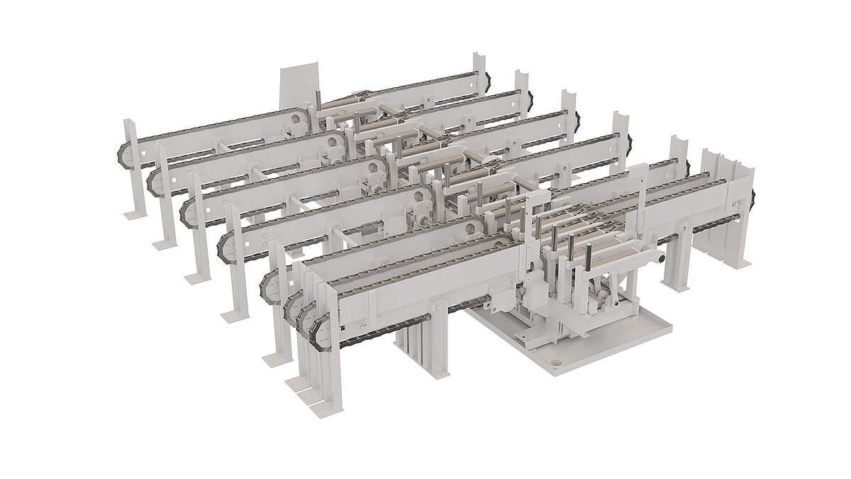 The universal magazine without fixed compartment division is an effective solution for the pre-storage and automatic reloading of material bars of various dimensions, qualities and shapes. The use of a load-bearing long-link roller chain facilitates transverse material transport, which means that only minimal force is required for operation.