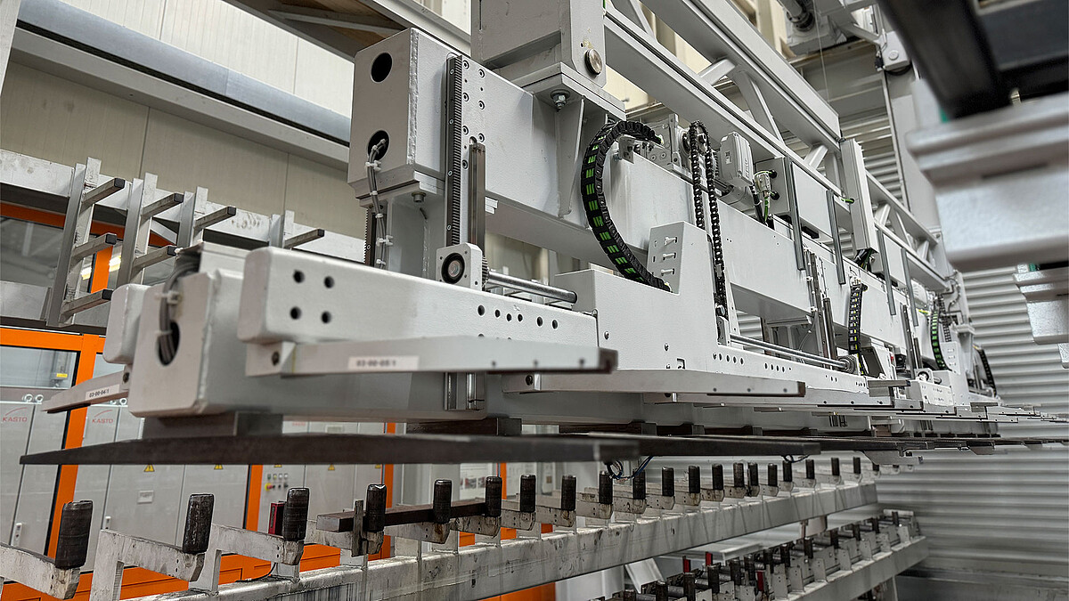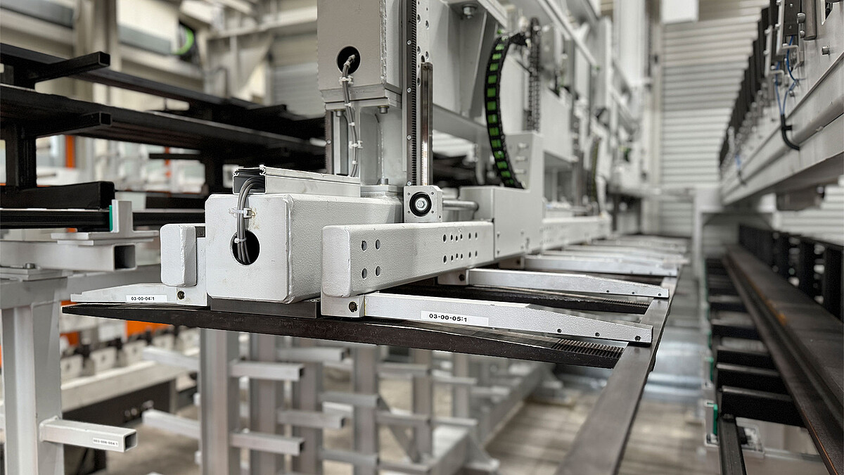 The KASTOpick sawcell is a reliable manipulator that enables bar material to be changed quickly between the long goods cassettes of the UNICOMPACT honeycomb system and a metal sawing machine. With its robust design and flexible forks, it offers a safe and reliable solution for handling bar material in a wide range of shapes and sizes. The mobile forks can handle a single bar with a maximum length of 6.5 metres or two bars in a row with lengths of up to 3.2 metres. The construction is designed for material of up to 2 x 1.3 tonnes and a diameter of 0 to 300 mm. The manipulator is designed to work unmanned around the clock and optimise the material flow in your company.