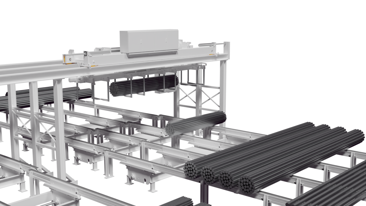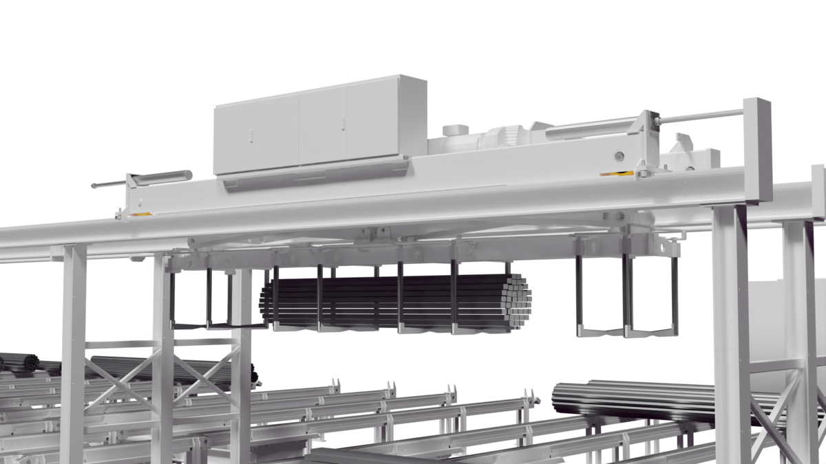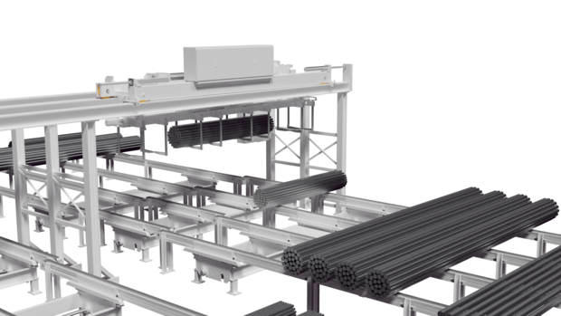 The system works with a combination of manipulator and material polder chain conveyors, whereby the material is reliably transported both lengthways and crossways. For optimum space utilisation, the KASTOrail manipulator travels on raised rails.