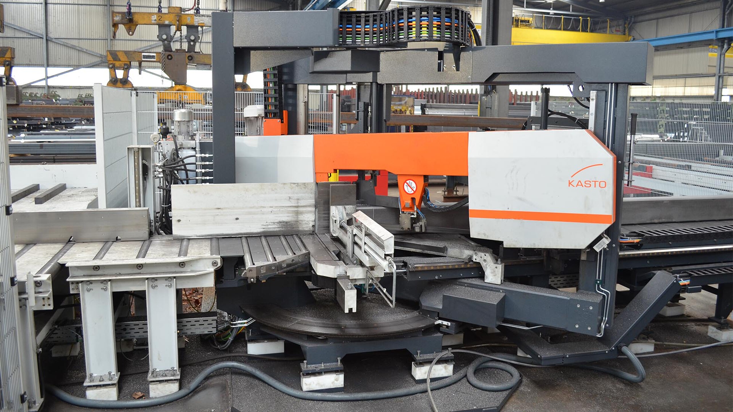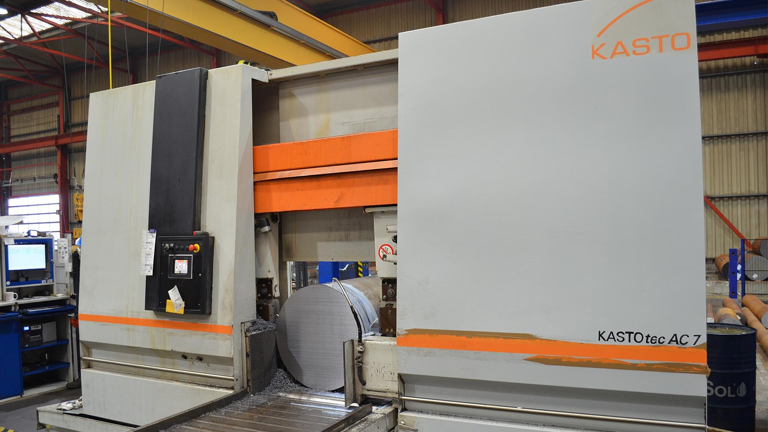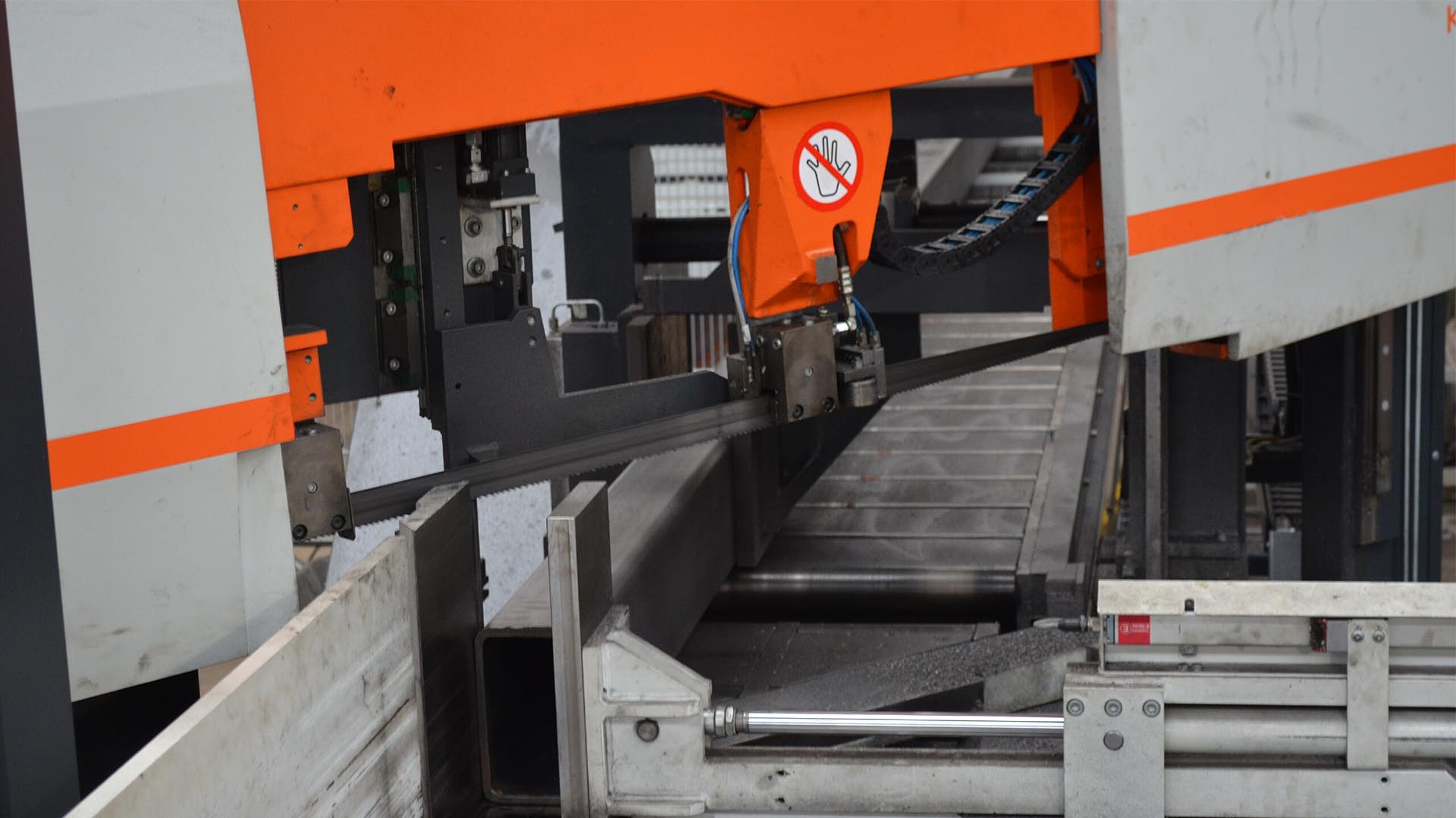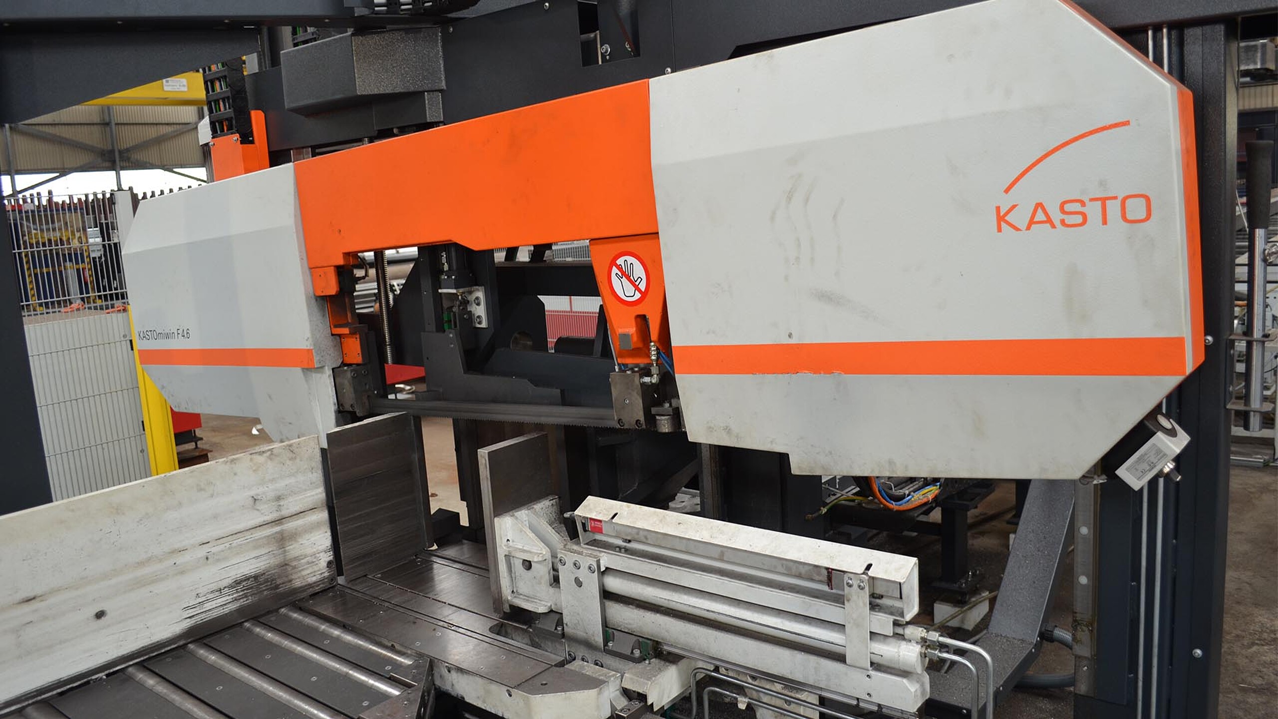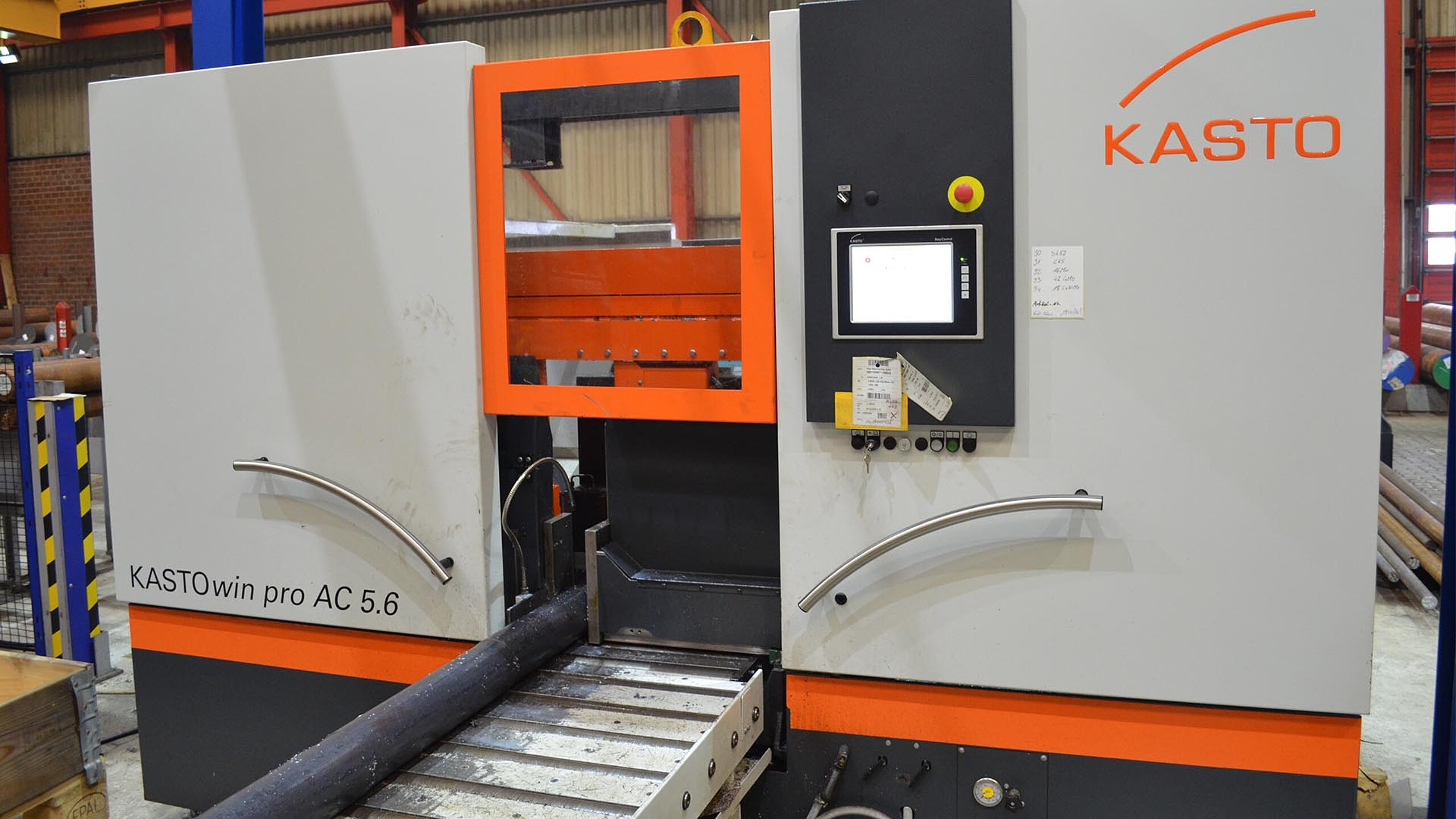 When cutting the up to twelve metre-long steel profiles, pipes, and solid materials, mitre cuts are more and more frequently requested. Those are cuts in the material that are not made at a "straight" 90-degree angle. Such cuts are made with a specific angle, the so-called mitre angle. This particular task can only be accomplished by using special saws – and one of the saws which Klöckner & Co Deutschland relies on is the KASTOmiwin F 4.6 from KASTO. "Not just any KASTOmiwin is used for this task," Kumpf revealed, "We use the very first model ever produced from this series." The machine optimised for mitre cuts is based on the successful bandsaw series, KASTOwin that is suitable for series and production sawing of solid materials, pipes, and profiles.