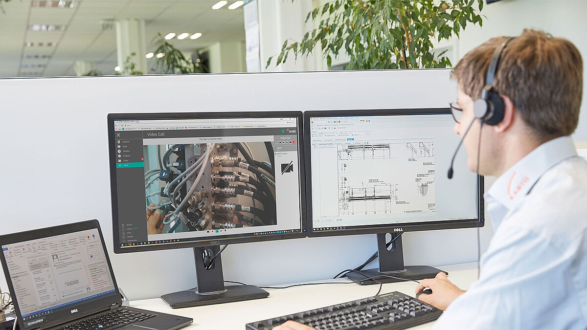 Le technicien du service d'assistance KASTO est virtuellement sur place avec le flux en direct et guide les collaborateurs en conséquence. Les formations complexes ou les déplacements coûteux sont ainsi superflus. En même temps, les
