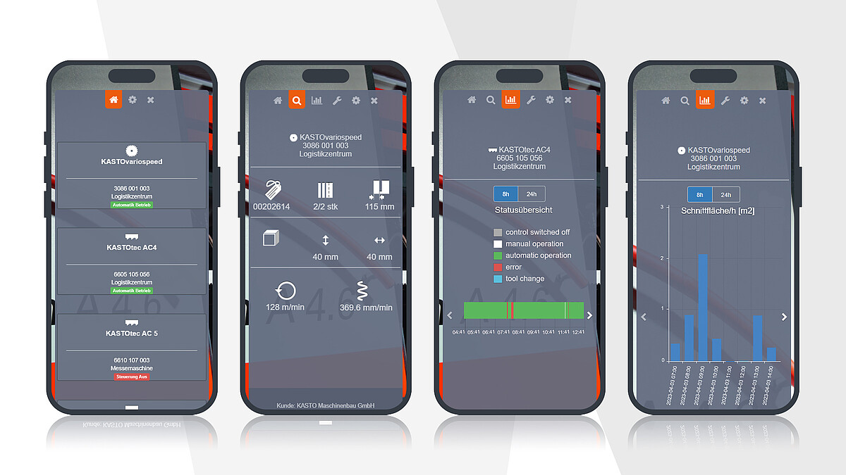 L'application web KASTOapp, indépendante de la plateforme, vous offre la possibilité d'obtenir un aperçu en direct de l'état de vos machines à scier. Les utilisateurs peuvent, à l'aide d'un navigateur, consulter à tout moment et de n'importe où l'état des machines à scier via un smartphone, une tablette ou un ordinateur, les surveiller et réagir rapidement en cas de besoin.