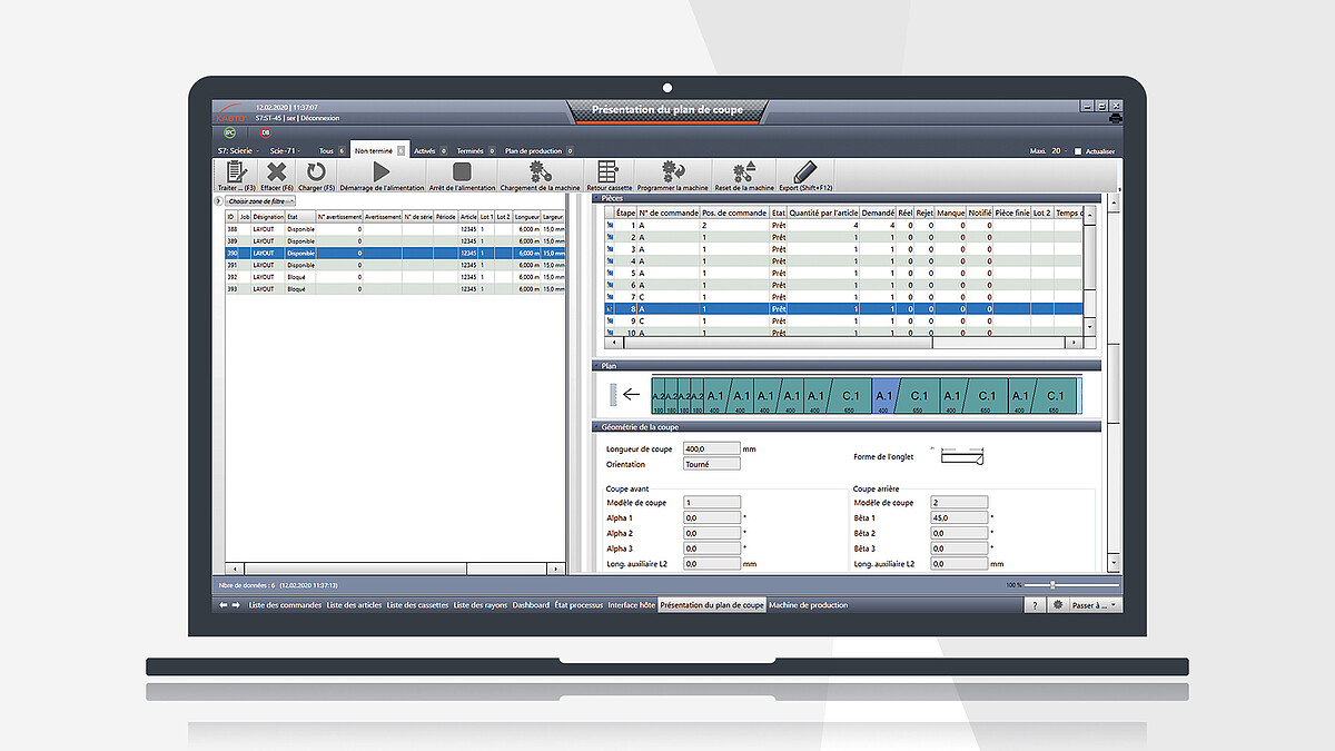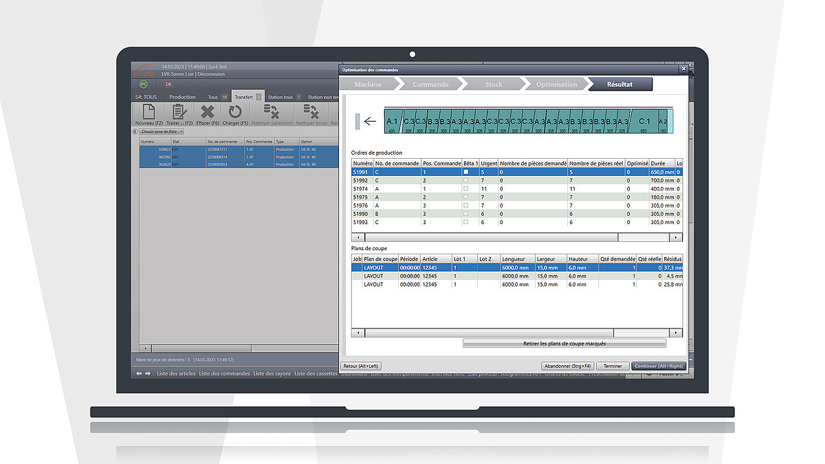 KASTOoptisaw assiste la fabrication grâce à des algorithmes performants : Différentes dispositions de coupes possibles sont modifiées successivement de manière itérative et également combinées entre elles afin d'élaborer en permanence une meilleure solution. L'outil d'optimisation est entièrement intégré dans le WMS KASTOlogic.