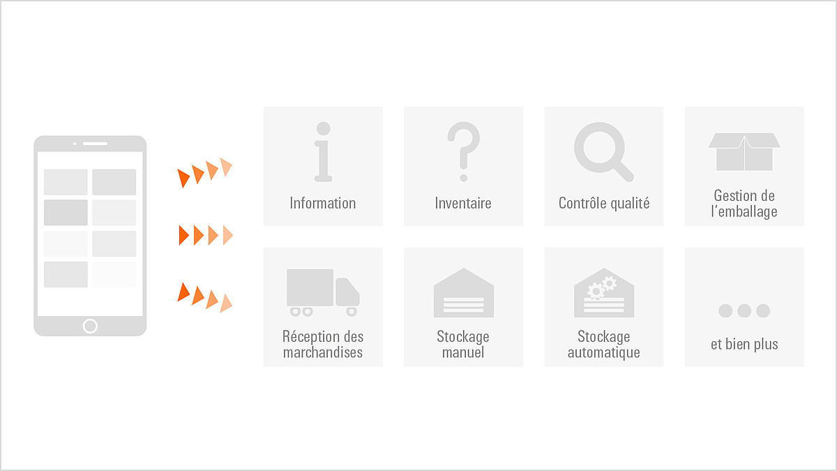 La mise en stock, la préparation de commandes, l’expédition, l’inventaire ou le contrôle qualité sont réalisés de manière mobile et guidée par le système. Cela réduit les erreurs, renforce la fiabilité des processus et facilite l’intégration des nouveaux collaborateurs.