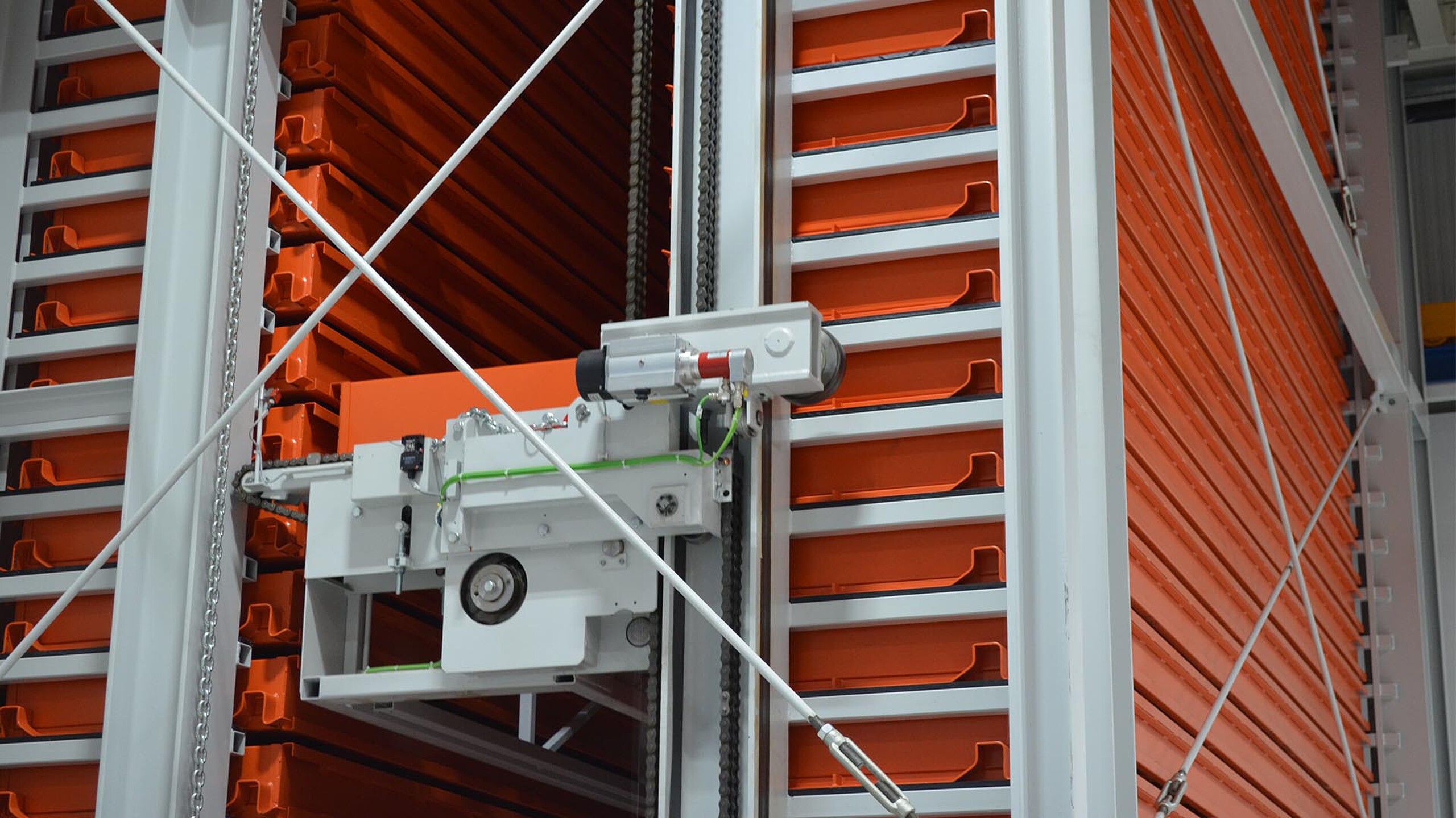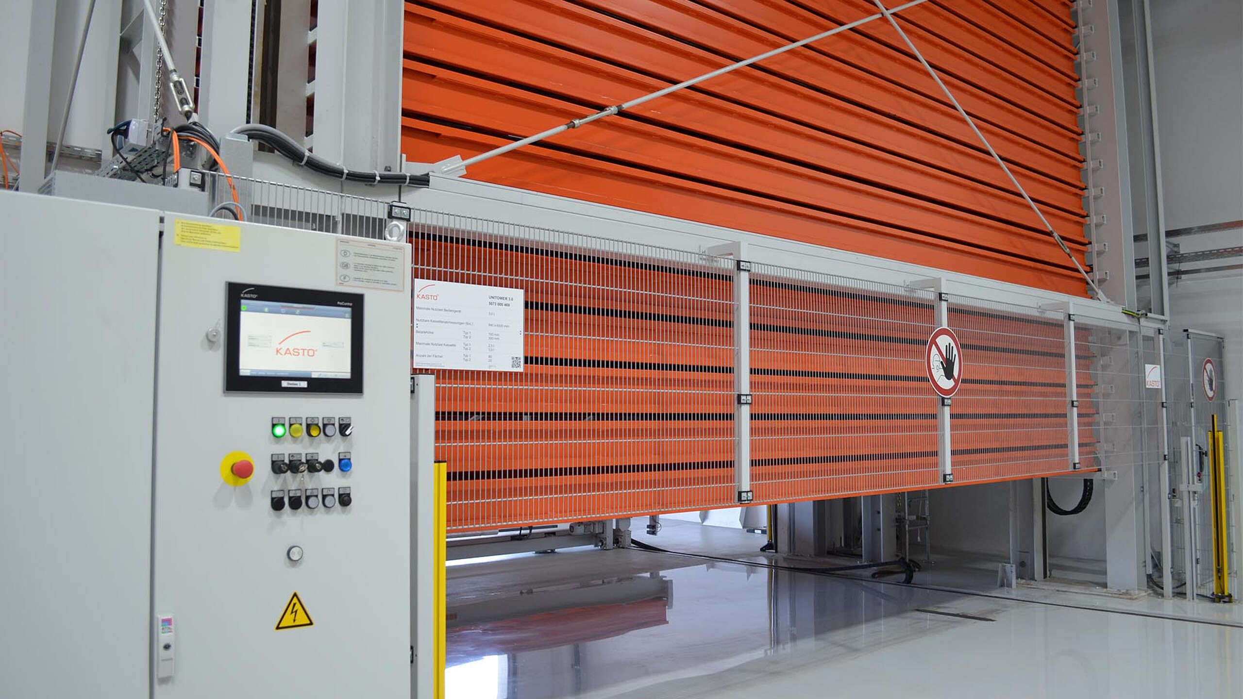 Les produits longs usinés sur les scies sont stockés dans une tour de stockage du type UNITOWER livrée également par KASTO. Haute de 15,59 mètres, elle accueille 100 cassettes pouvant loger des matériaux d’une longueur maximale de 6,5 mètres. Elle permet d’utiliser deux types de cassettes d’une hauteur de chargement de 160 ou de 300 millimètres. Selon le modèle, une cassette peut supporter 2,5 ou 3 tonnes. La manipulation des supports de charge est effectuée par un transstockeur selon le principe du produit vers l’homme. « Les temps d’accès sont ainsi extrêmement courts et la manipulation des matériaux encombrants s’en trouve grandement facilitée », constate M. Kerscher.