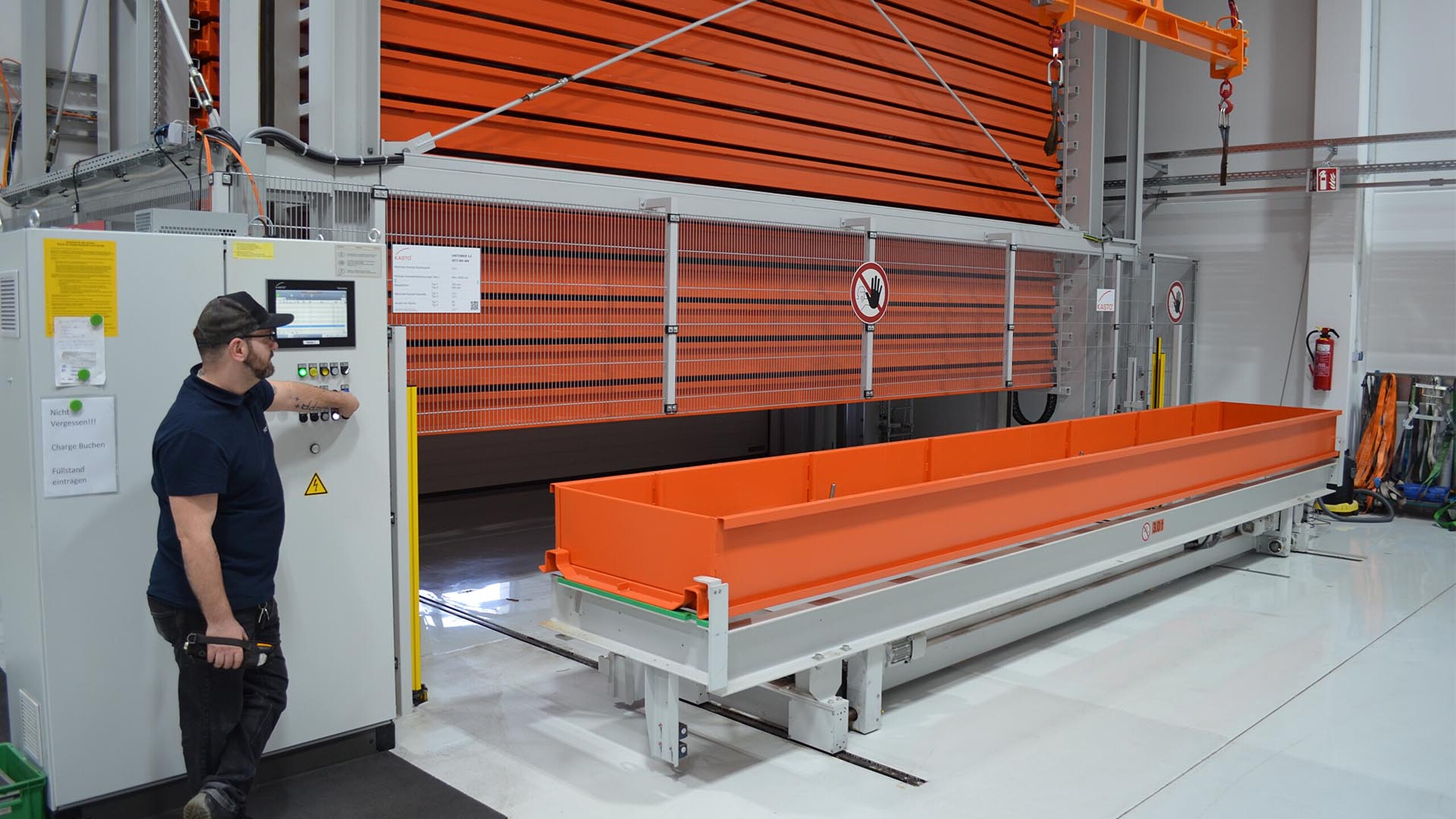 Par le passé, les collaborateurs de microart devaient stocker et déstocker péniblement à la main les produits longs – aujourd’hui, il suffit pour cela d’appuyer sur un bouton. Le matériau arrivant par camion est chargé sur une cassette libre et transporté dans le magasin à l’aide d’un chariot. Le transstockeur trouve lui-même l’emplacement adéquat au moyen du système de gestion des stocks KASTOlogic. Les collaborateurs obtiennent les données des commandes par le biais d’une plateforme logicielle implémentée dans toute l’entreprise et lance le déstockage du matériau requis par simple pression d’un bouton. Un autre chariot fournit la cassette correspondante sur la station de déstockage. De là, les produits longs sont placés à la main ou au moyen d’un pont roulant sur le chargeur d’une des deux scies. Un pupitre de commande permet de programmer les données de coupe requises sur ces scies qui exécutent ensuite automatiquement les ordres.