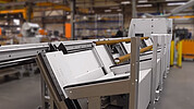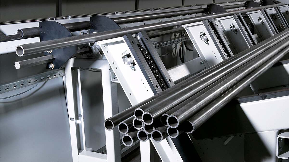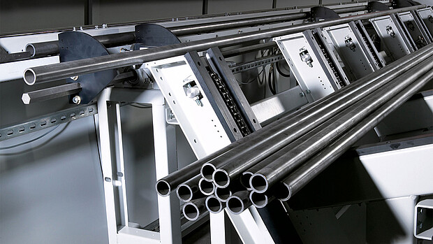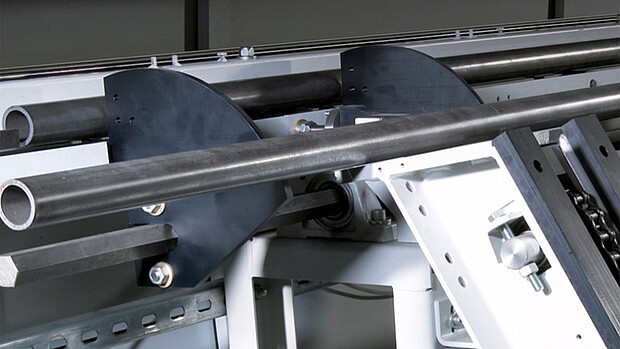 Befindet sich eine Stange vor den Vereinzelungs- und Ladescheiben, stoppt der Verschiebewagen, und die Stange wird auf die Zufuhrrollenbahn geladen. Anschließend fährt der Verschiebewagen zurück und der nächste Förderzyklus beginnt. Ist keine Stange mehr auf den Auflagerungen vorhanden, schaltet sich die Sägeanlage automatisch ab.