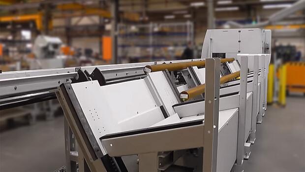 Nachdem die Stangenbunde in den Auflage-Rungen abgelegt wurden, wird das Verfahren des Verschiebewagens manuell ausgelöst. Sobald eine Stange am Verschiebewagen anliegt, wird dieser automatisch angehoben.