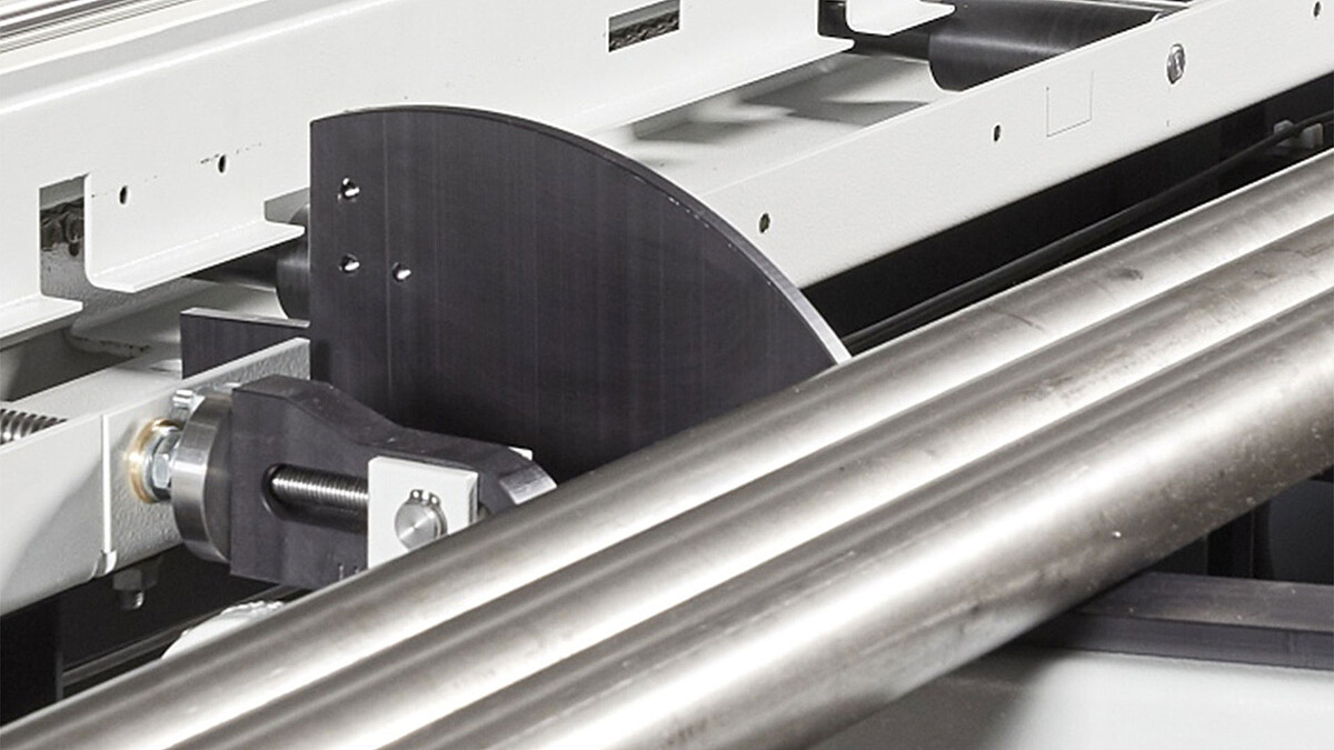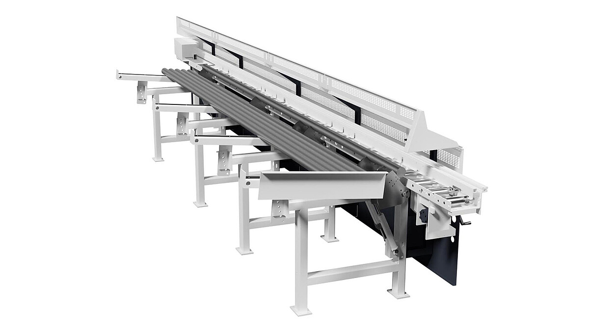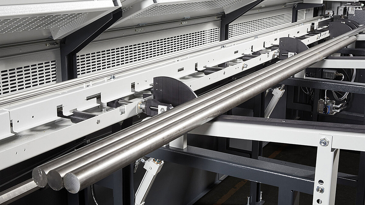 Dieses Magazin ermöglicht die automatische Nachladung von Stangenmaterial gleicher Abmessungen und Materialgüte. Es verfügt über manuell neigungsverstellbare Materialauflage-Rungen zur Vorlage der Materialstäbe. Die Einstellung der Vereinzelungsnocken, die auf den jeweiligen Materialdurchmesser abgestimmt wird, erfolgt präzise über ein Handrad mit digitaler Anzeige. Zudem ist die Magazinrollenbahn mit frequenzgesteuerten Transportrollen ausgestattet, die für einen gleichmäßigen und kontrollierten Materialfluss sorgen.