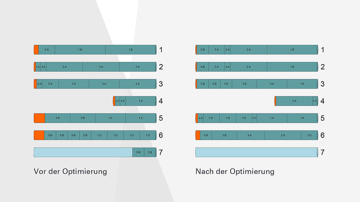 - Konfigurierbare Gewichtung der Ziele: Geringe Schrottmenge vs. kurze Stäbe bevorzugt verbrauchen, geringer Zeitbedarf (KASTOcenter)
