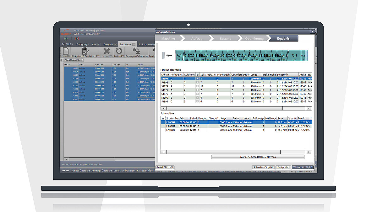 KASTOoptisaw unterstützt die Fertigung durch leistungsstarke Algorithmen: Iterativ werden verschiedene, mögliche Abschnittsanordnungen sukzessive verändert und auch miteinander kombiniert, um kontinuierlich eine bessere Lösung zu erarbeiten. Das Optimierungswerkzeug ist vollständig in das WMS KASTOlogic integriert.