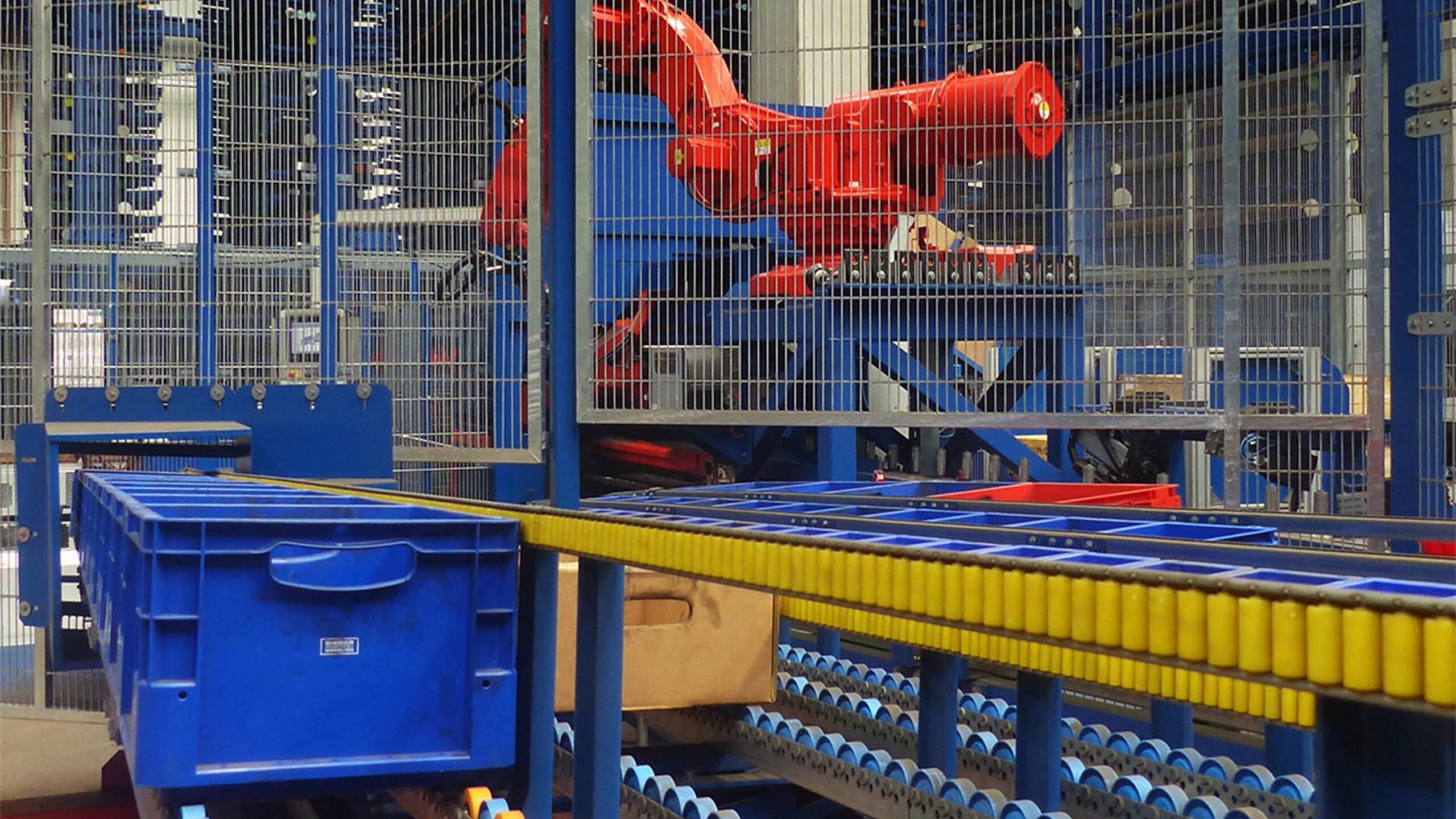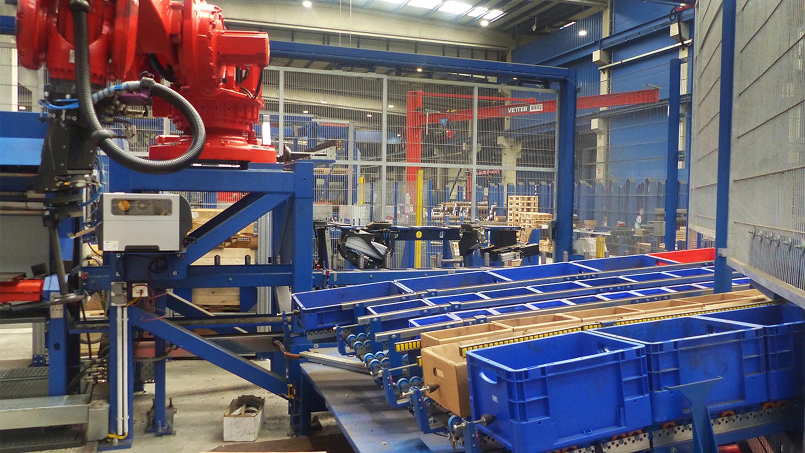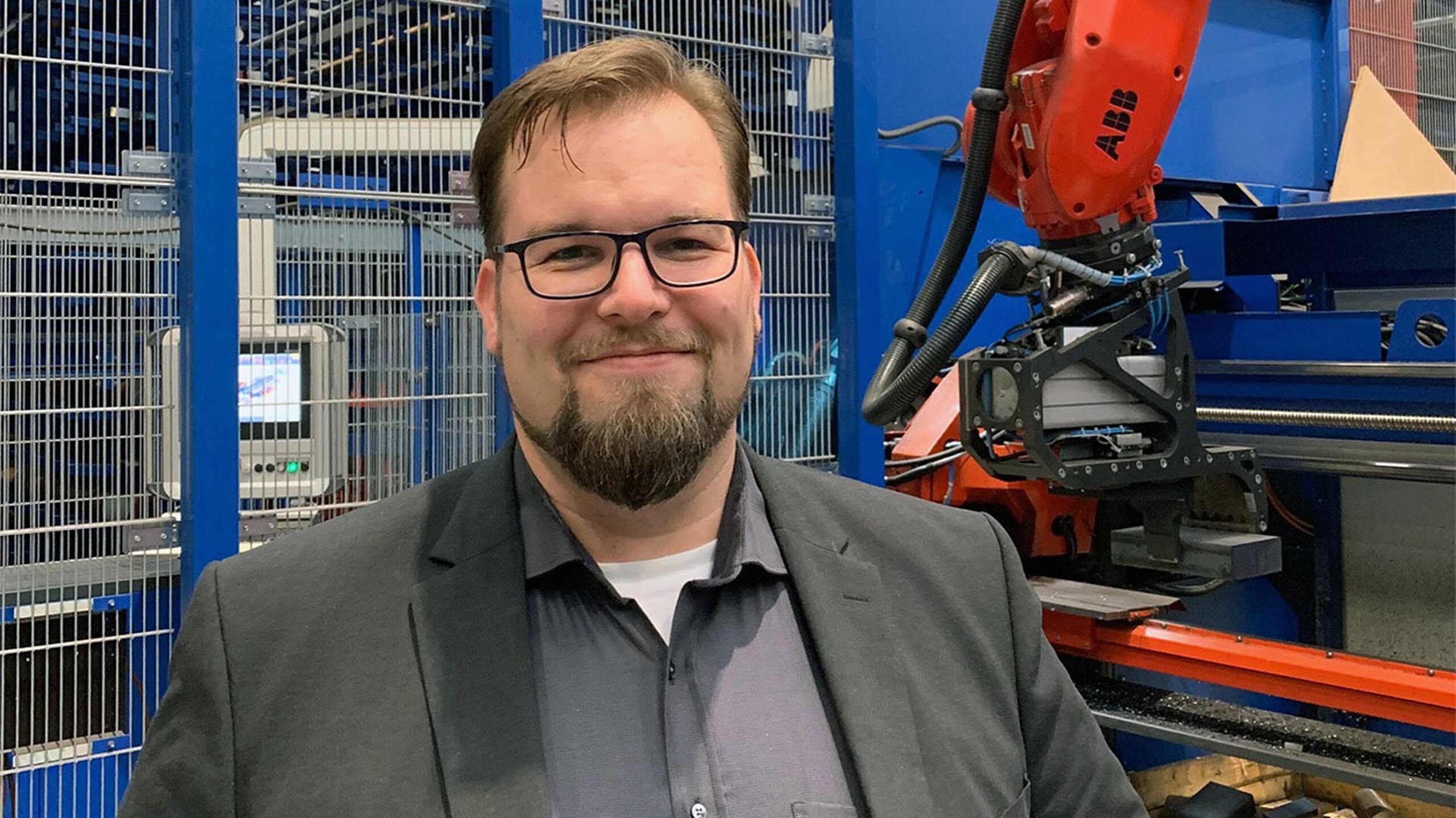 Das neue Sägezentrum KASTOcenter varioplus 4 bietet auf einer Länge von 50 Metern, einer Breite von sieben Metern und einer Höhe von neun Metern beeindruckende Ausmaße. „Wir haben hier etwa 1.500 Fächer und Platz für Materialien bis sieben Meter Länge und 330 Millimeter Durchmesser“, erklärt Marcel Finkernagel. Die Ein- und Auslagerung des Langguts übernimmt ein Regalbediengerät (RBG), das mit einer Geschwindigkeit von bis zu 60 Metern pro Minute über dem Regalblock verfährt. An das Lager angebunden sind eine vollautomatische Produktionskreissäge vom Typ KASTOvariospeed und eine Bandsäge KASTOtec SC 4, an die ein Palettenlift mit Platz für acht Europaletten angeschlossen ist. An der Kreissäge übernimmt ein KASTOsort-Roboter das Behältermanagement: Acht Palettenplätze auf einem Karussell wechseln automatisch, der Roboter greift die Paletten selbstständig und bestückt sie. „Das geht auch übers Wochenende personenlos und es liegt sogar schon das passende Etikett im Behälter, sodass bis dahin kein Mitarbeiter mehr eingreifen muss“, erklärt Finkernagel.