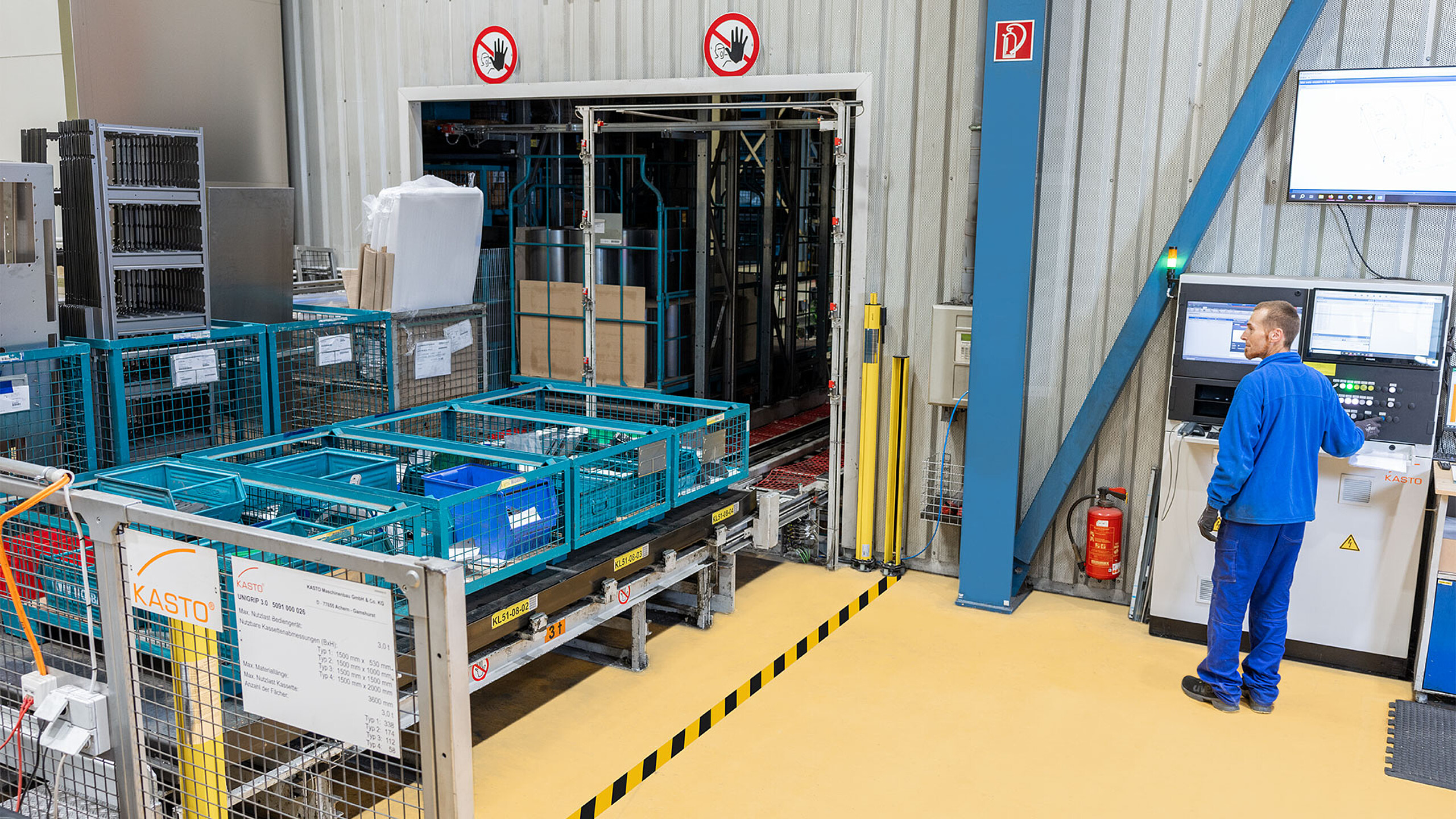 Der Blech-Allrounder nutzt nun seit 17 Jahren ein KASTO UNILINE mit 13 Ausgabestationen für die Rohstoffe und ein KASTO UNIGRIP mit drei Ausgabestationen als Pufferlager für Halbfabrikate. Das UNIGRIP 3.0 bietet 682 Plätze, die Gitterboxen in mehreren Größen aufnehmen können – von 530 bis 2.000 Millimeter Höhe. Die maximale Nutzlast liegt bei drei Tonnen je Kassette. An den Ausgabestationen überwachen Sensoren die Dimensionen der Ladung auf den Platten und stoppen beim Überschreiten der Vorgaben den Betrieb.