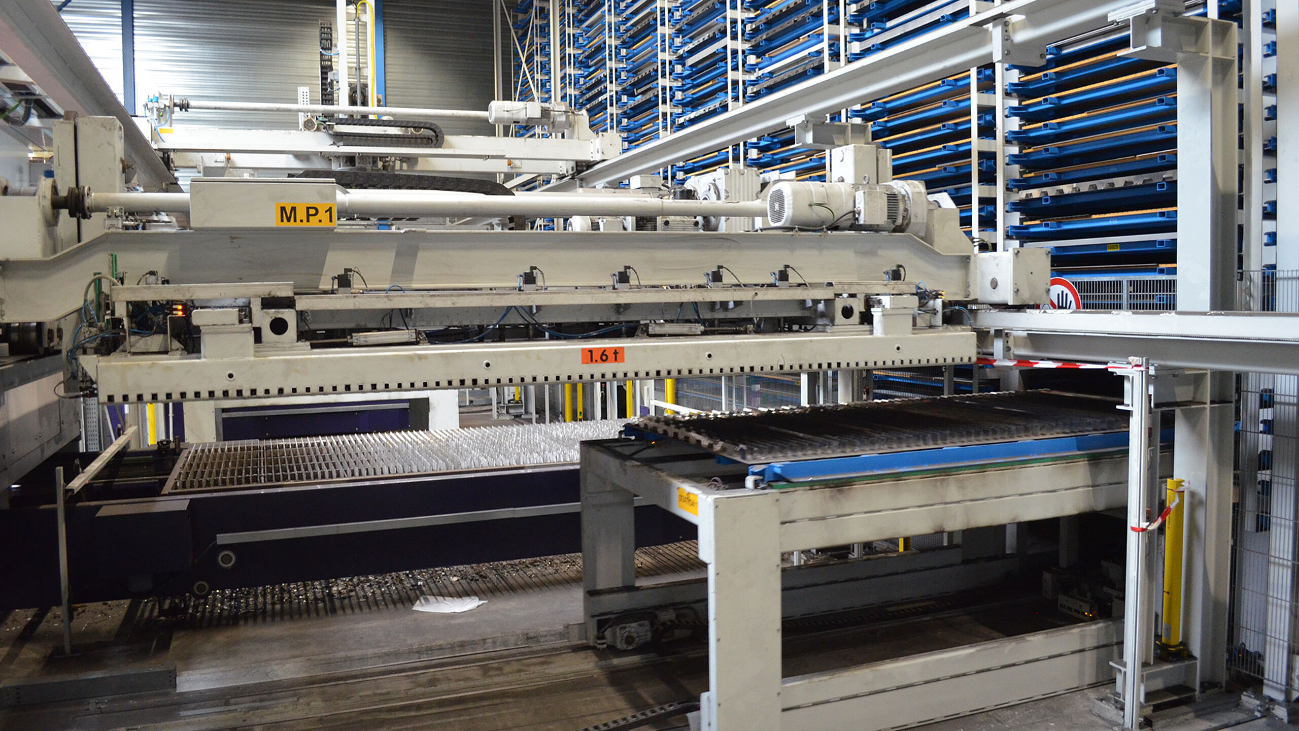 Um den wachsenden Kundenstamm zuverlässig und schnell bedienen zu können, hat De Cromvoirtse nicht nur den Bestellprozess, sondern auch die Teilefertigung weitgehend automatisiert: Die Bearbeitungsmaschinen laufen rund um die Uhr, sieben Tage die Woche, davon 1,5 Tage komplett mannlos. Ein anderer wichtiger Faktor für den Erfolg ist der hohe Lagerbestand. Zwischen 400 und 500 Tonnen Material liegen am Standort durchschnittlich auf Vorrat. Auch die Lagertechnik ist modern: Ein doppelseitiges KASTO-Längslagersystem vom Typ UNILINE mit knapp 1.000 Lagerplätzen sorgt nun schon seit 2011 für eine effiziente Bereitstellung der Bleche. Für die verschiedenen Materialien, Formate und Reststücke stehen unterschiedliche Palettentypen zur Verfügung. Ein Regalbediengerät, das zwischen den beiden Reihen des Systems verfährt, lagert die gewünschten Artikel auf Anforderung vollautomatisch ein und aus.