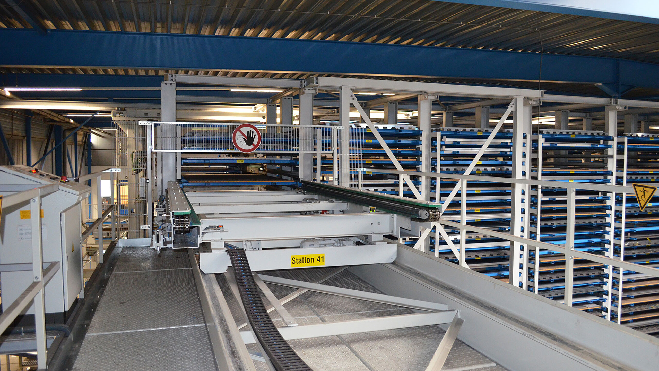 Das kompakte Lagersystem besteht aus einem Doppelturm. Dieser bietet mit einer Höhe von 8,5 Metern auf einer geringen Grundfläche Platz für knapp 80 Paletten, die Bleche mit Abmessungen bis zu 3.000 x 1.500 Millimeter aufnehmen. Das Handling der Ladungsträger übernimmt ein Regalbediengerät mit Lasttraverse, das in der Mitte angeordnet ist. Damit muss zur Ein- und Auslagerung nicht das ganze Lager bewegt werden, sondern nur die jeweilige Palette. Das sorgt für schnelle Zugriffszeiten und ermöglicht in Verbindung mit der energieeffizienten Antriebstechnik deutliche Energieeinsparungen. Für maximale Flexibilität ist das UNITOWER- an das bestehende UNILINE-Lager angebunden: Eine Brücke mit einem Längswagen, der auf einer Schiene verfährt, verbindet die beiden Systeme in luftiger Höhe miteinander. „Damit können wir automatisch Paletten zwischen den Lagerbereichen tauschen, ohne dass uns am Boden wertvoller Platz verloren geht“, erklärt van den Hurk.