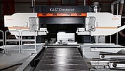 KASTOmaxcut AM ist die ideale Sägemaschine für die wirtschaftliche und vollautomatische Bearbeitung von Aluminiumplatten mit einer Dicke von min. 6–200 mm. Je nach Maschinenausführung können Aluminiumblöcke mit einer Abmessung von max. 2.200 x 850 mm und Blocklängen bis 4.100 mm bearbeitet werden. Besonders feingewuchtete Antriebselemente und die speziell entwickelten Bandführungen ermöglichen sehr hohe Schnittgeschwindigkeiten und Schnittleistungen, bei gleichzeitig standzeitoptimiertem, werkzeugschonendem und ruhigem Sägeprozess. Eine optimierte Umhausung der Bandlaufräder ermöglicht einen optimalen Späneflug zum Übergabepunkt an eine Absauganlage. Auf Wunsch ist eine vollautomatische Blockzuführung und Plattenentsorgung lieferbar.