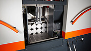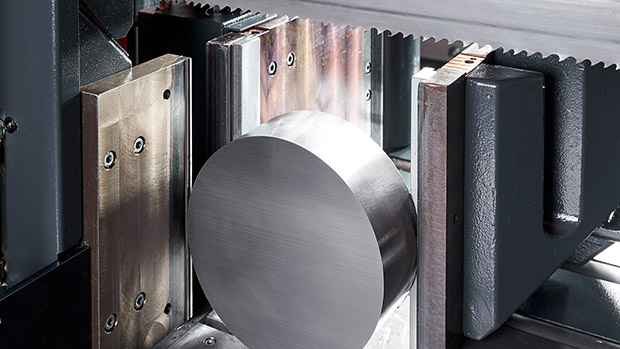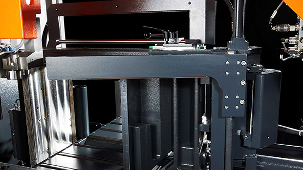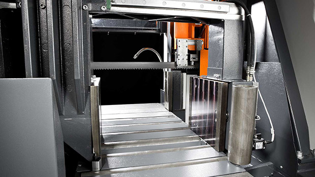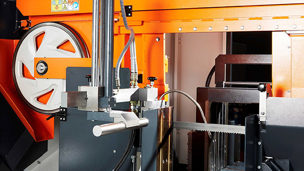 Frequenzgeregelter Stirnrad-Sägeantrieb mit Überlastüberwachung sowie Spanndrucküberwachung für Bandspannung und beide Spannstöcke zählen zur serienmäßigen Ausstattung für Arbeitsprozesse bei Einzelschnitten, kleineren und mittleren Losgrößen sowie im Großserienbereich.