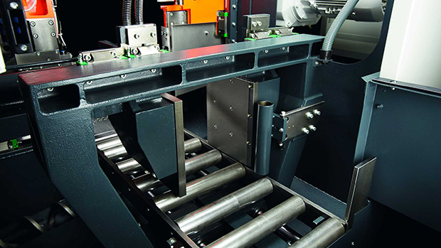 Bandsägeautomat für Serienschnitte in leicht bis schwer zerspanbaren Werkstoffen, in Vollmaterial, Rohren und Profilen. Moderne, serienmäßig vorgespannte Linearführungen (Kugelumlaufeinheiten mit zwei fettgeschmierten Führungswagen) sorgen für eine maximale Gebrauchsdauer.